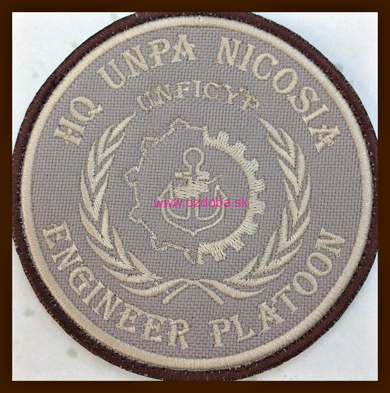 ENGINEER PLATOON je výšivka, ktorú nosia príslušníci mierovej misie UNFICYP NA CYPRE. Okrúhla priemer 8 cm podšitá háčikovov časťou suchého zipsu.